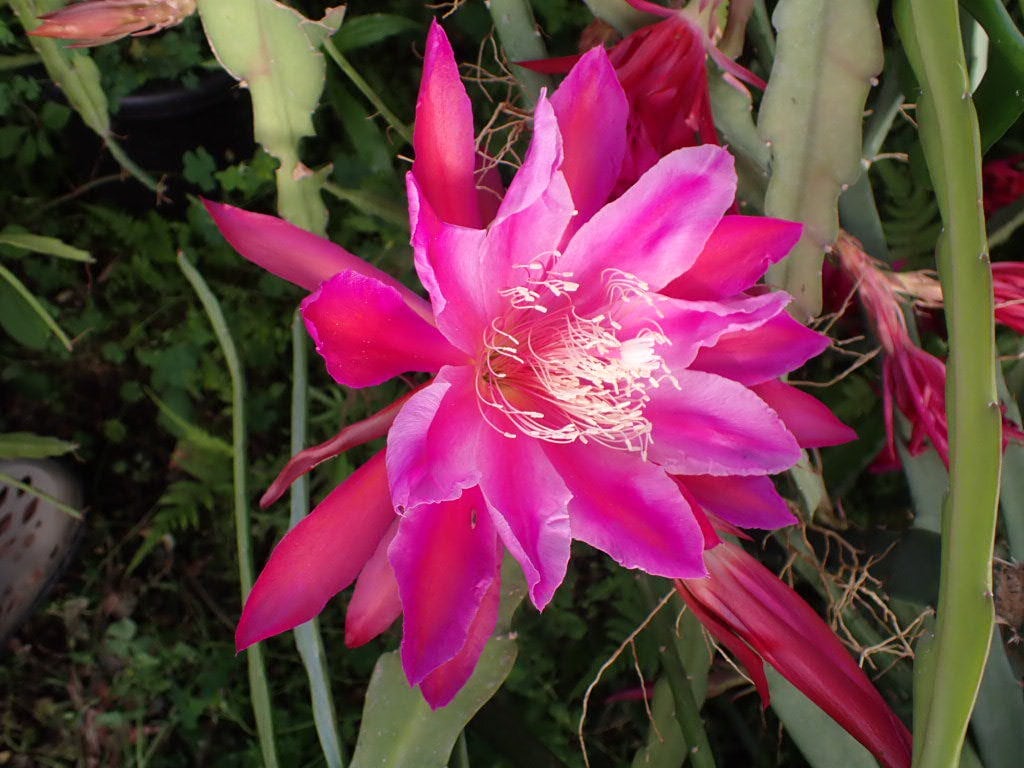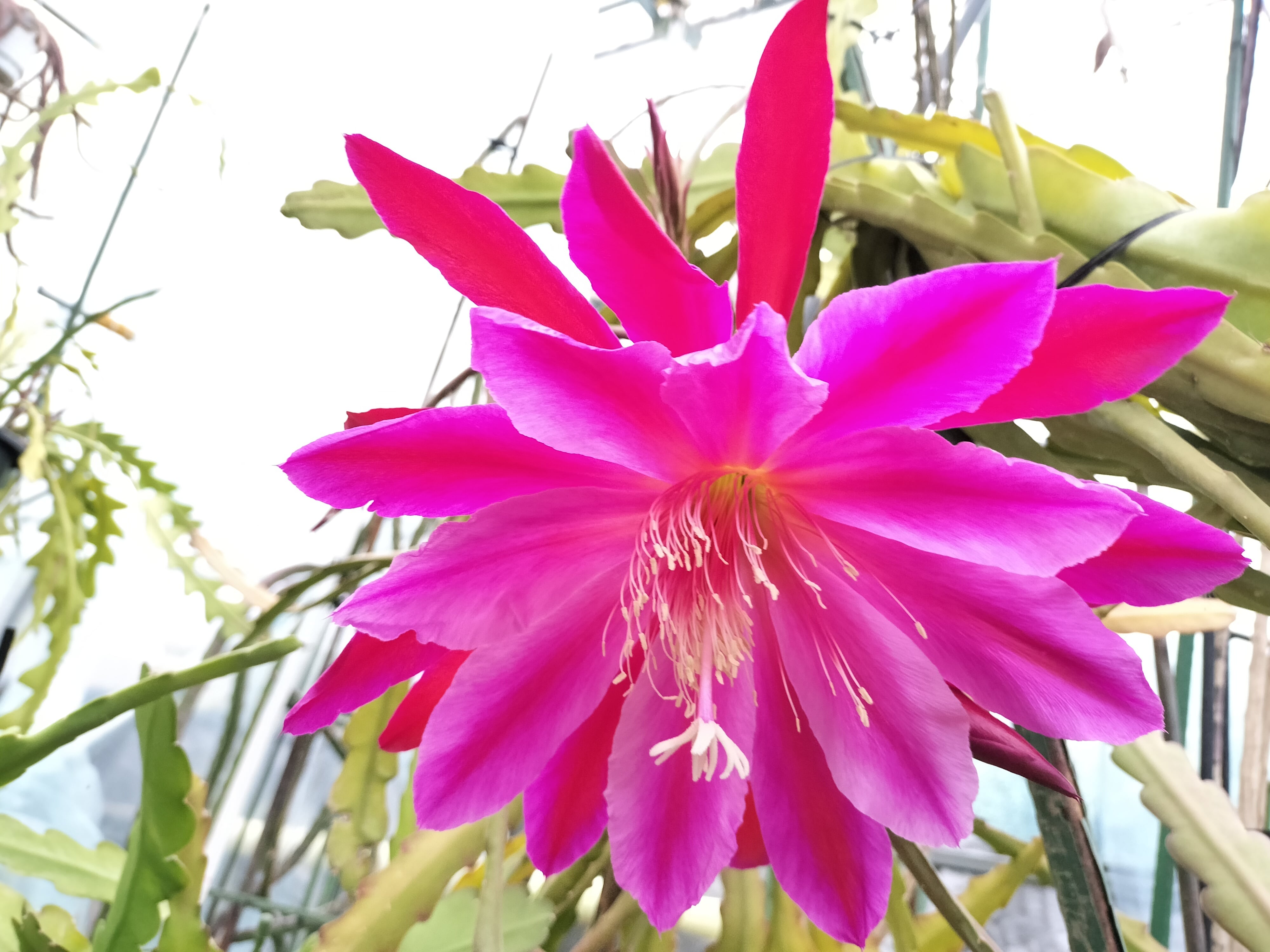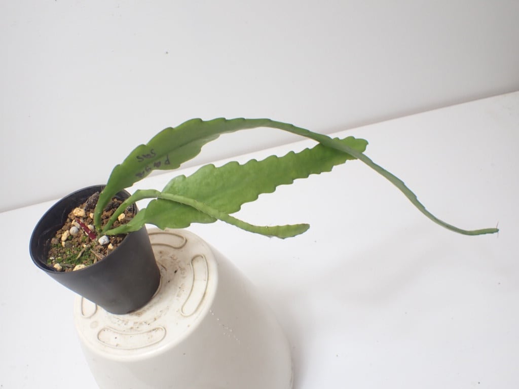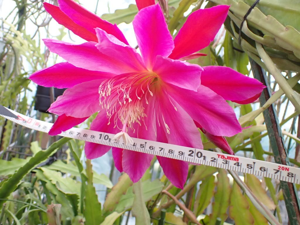 12/15更新 Epiphyllum hybrid 'Pegasus' クジャクサボテン、ペガサス 過去に発行された書籍にもよく載るクジャクサボテンの古典的な名品種です。 クジャクサボテン最大花径とされており、蕾を摘花して花数を絞れば、最大43cmに達するようです。 花弁にフリルがあるピンク色の鮮やかな花を咲かせます。