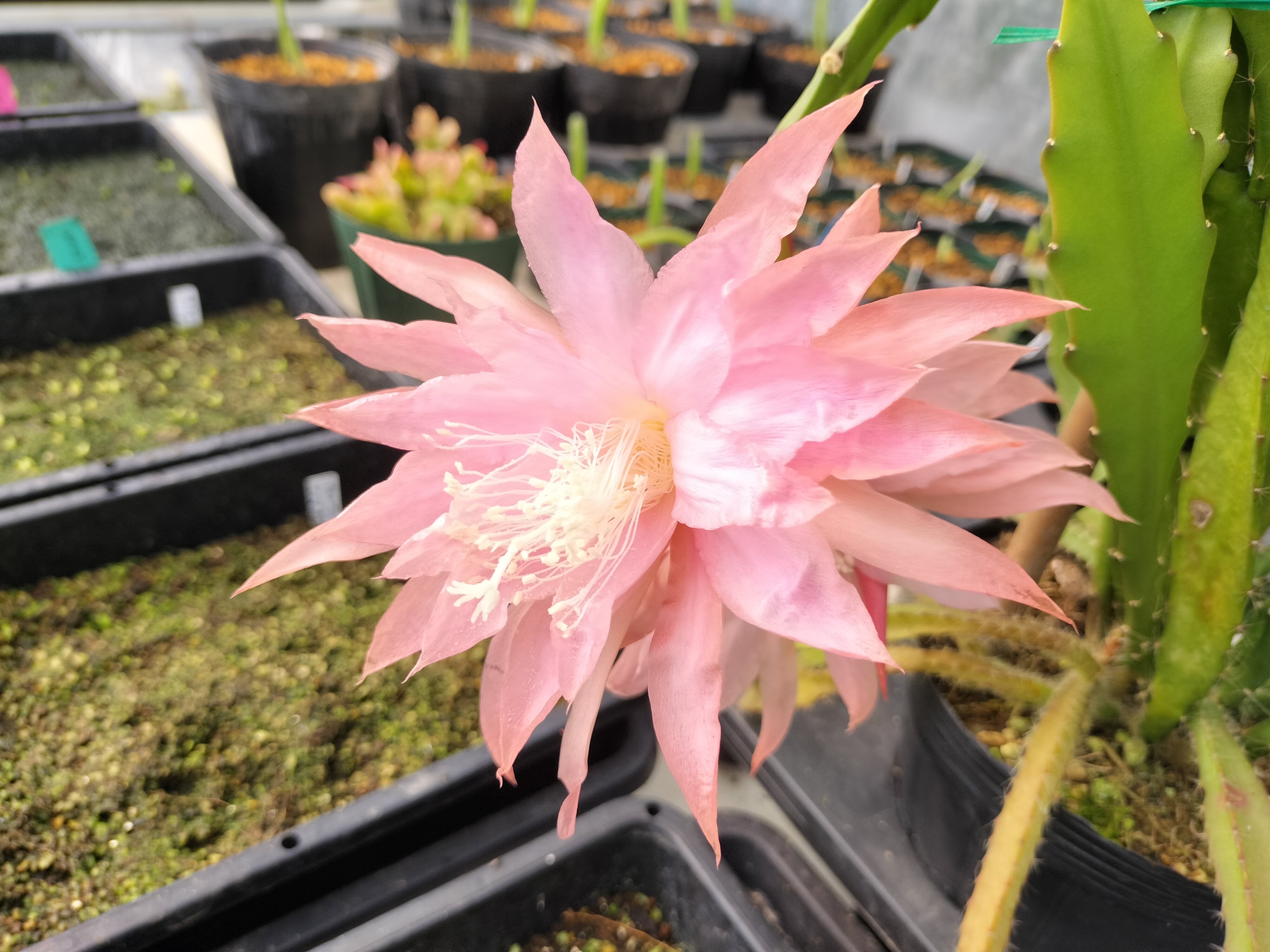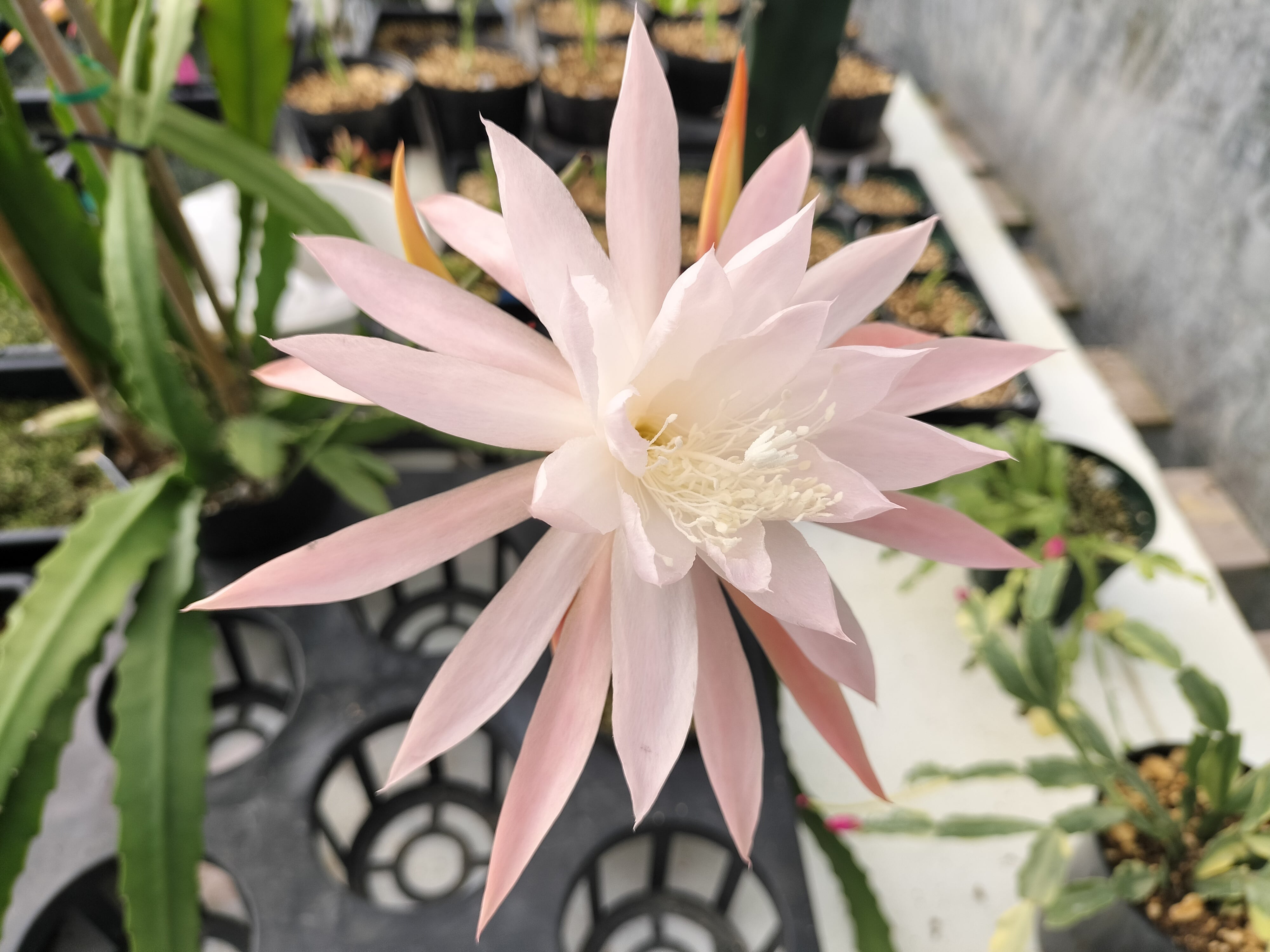 二季咲きの八重咲き品種であり、春と秋冬に、花径12~13cm程度の淡いピンク色の花を咲かせます。