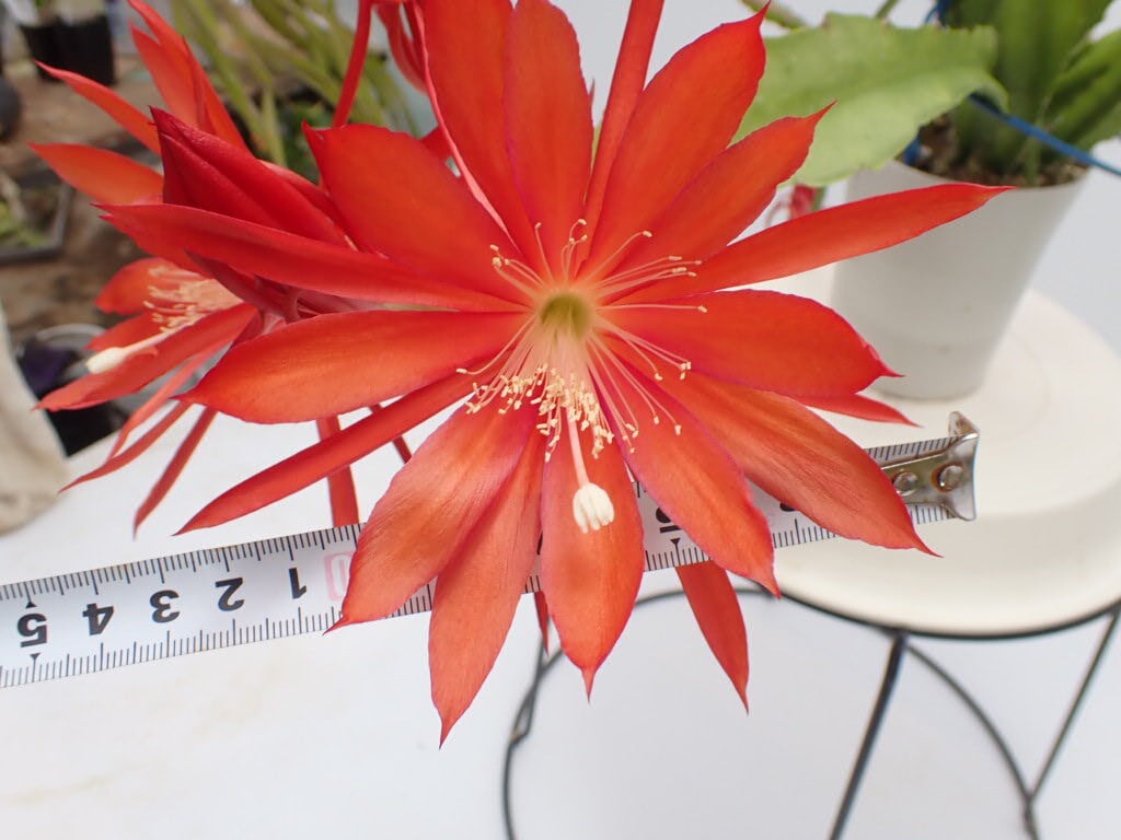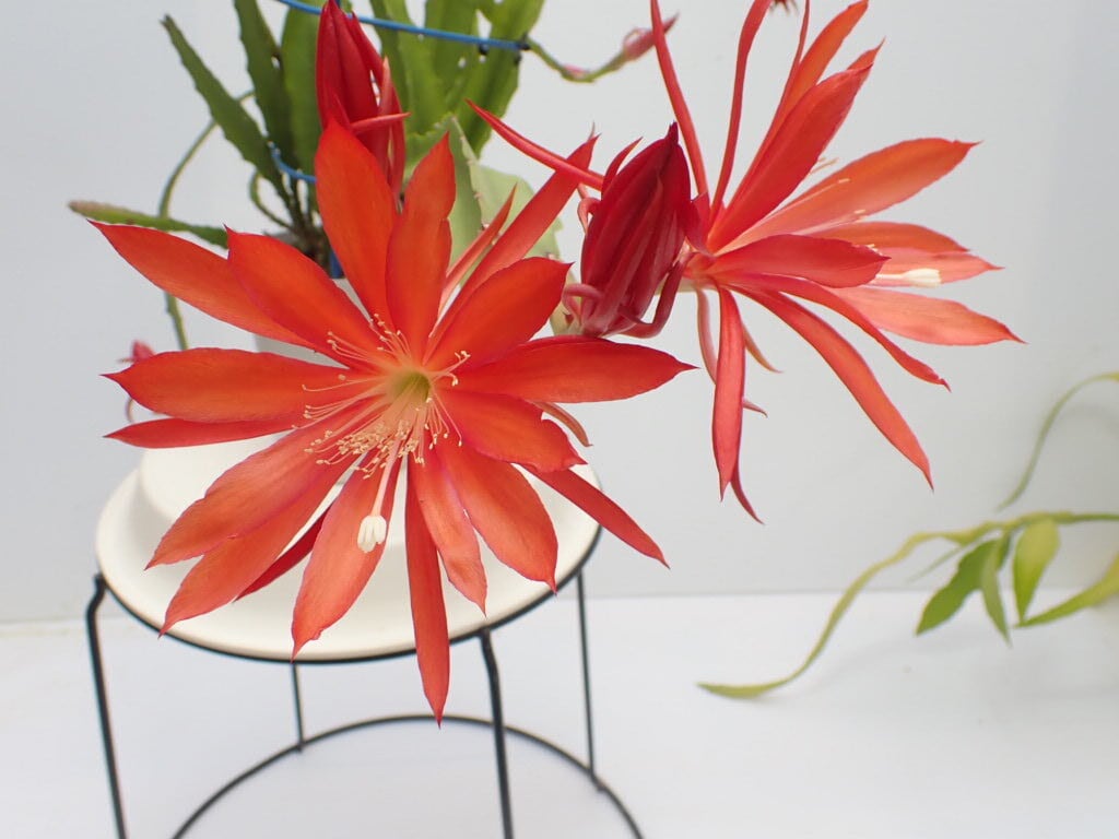 10/25更新 Epiphyllum hybrid '暁朱雀' 当ショップ、UMBER KELPオリジナル品種です。 早春に、花径14cm程度の花弁の細い朱色の花を咲かせます。 矮性であり、体躯が小さいので花がより大きく見えます。