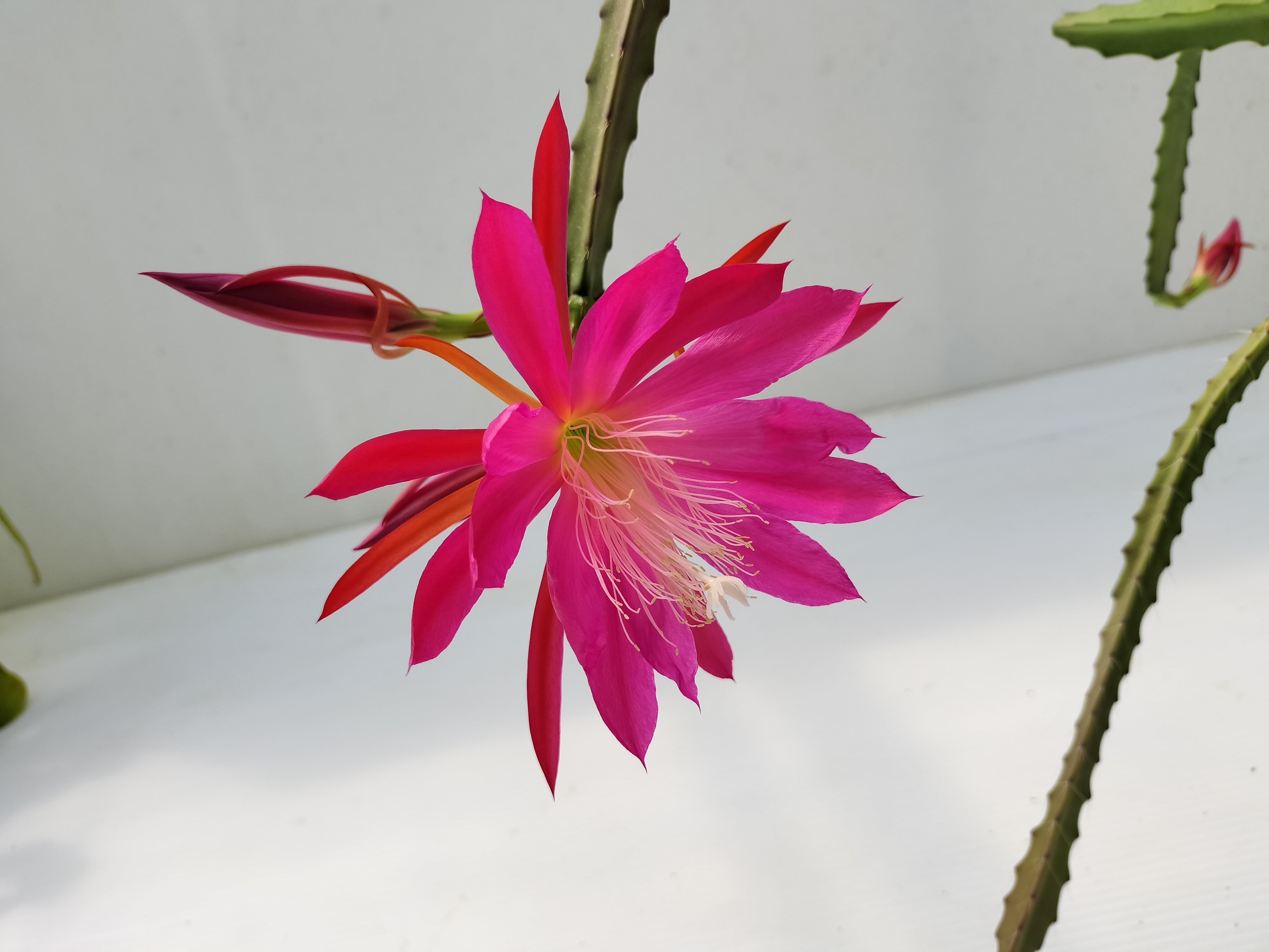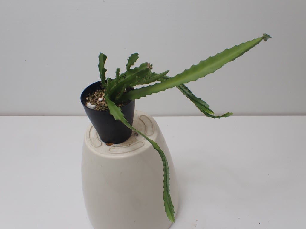 10/25更新 Epiphyllum hybrid '柳緑桃紅' 当ショップ、UMBER KELPオリジナル品種です。 二陵〜四稜の枝を出し、基本的には立ち性となります。 開花時期は4月頃となります。紫に近い紅色の花を咲かせます。 細い四稜の枝は、クジャクサボテンの中でも、あまり似たものが無い面白い形をしています。